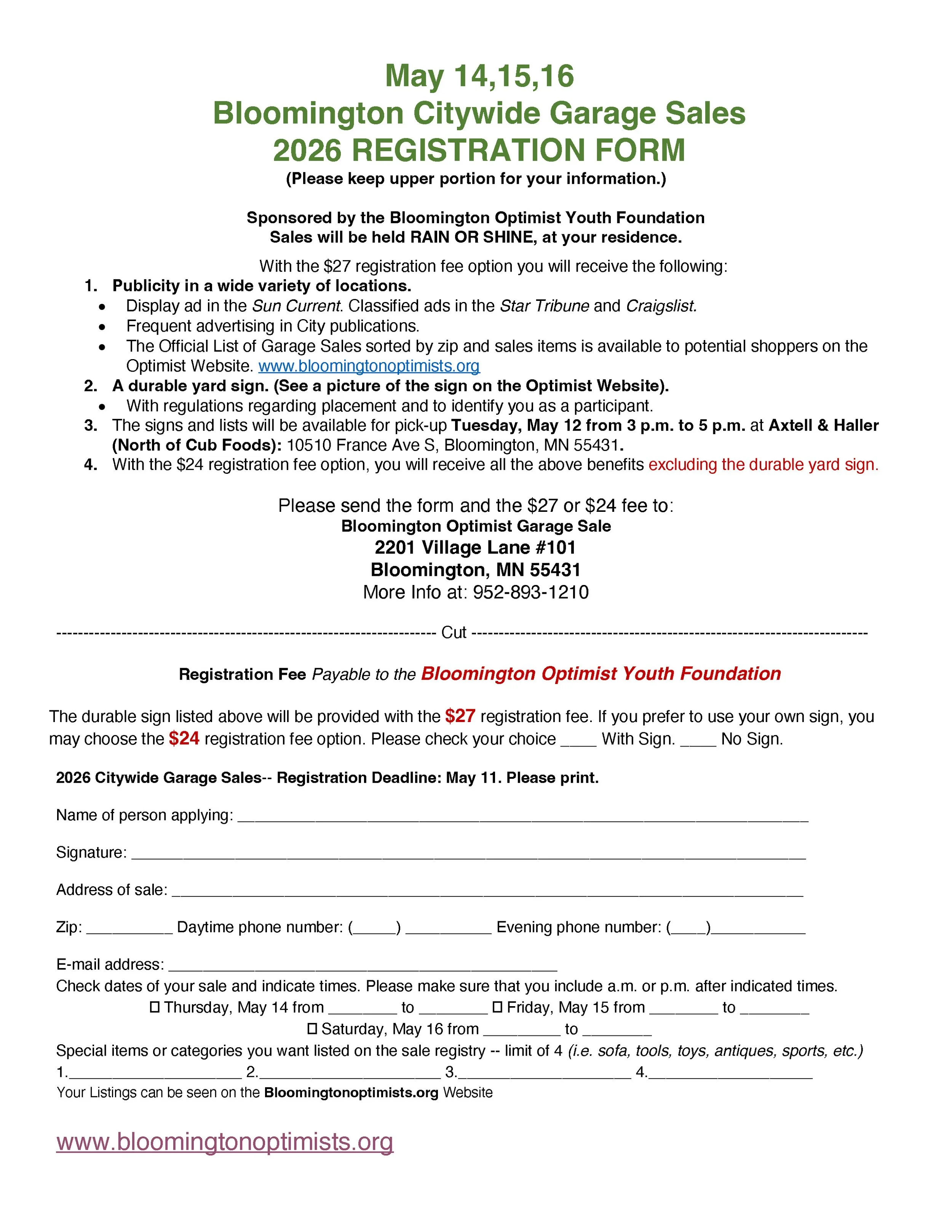Fill out the Registration Form, Mail by May 9th. To Bloomington Optimist Garage Sale - 2201 Village Lane #101, Bloomington, MN 55431More Info at: 952-893-1210Look for a complete list of Sales on May 13th.
